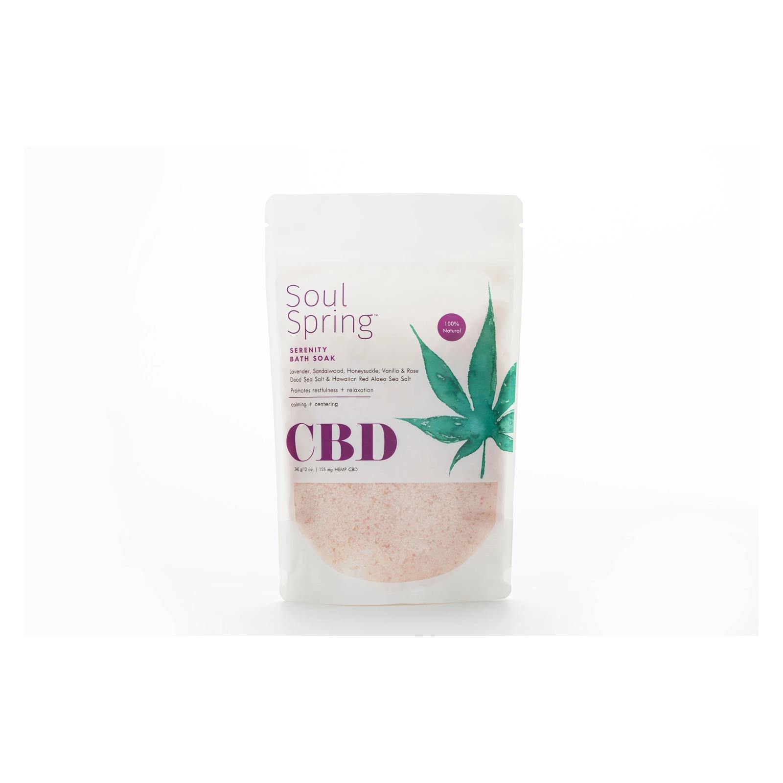SouOur Serenity Bath Soaks are made with the perfect balance of calming botanicals Lavender, Sandalwood, Vanilla, Rose and Hemp CBD. When combined with our mineral-rich blend of Hawaiian Volcanic Red Alaea Sea Salts, Dead Sea Salts and Epsom Salts, your skin will soak in the nourishing minerals, essential oils, and Hemp CBD to create a soul-filling oasis of serenity. Promotes calmness and relaxation. Add a cup or more to a warm tub of water, step in, and take a deep breath to find your center. The perfect elixir to help promote calmness and sleep.